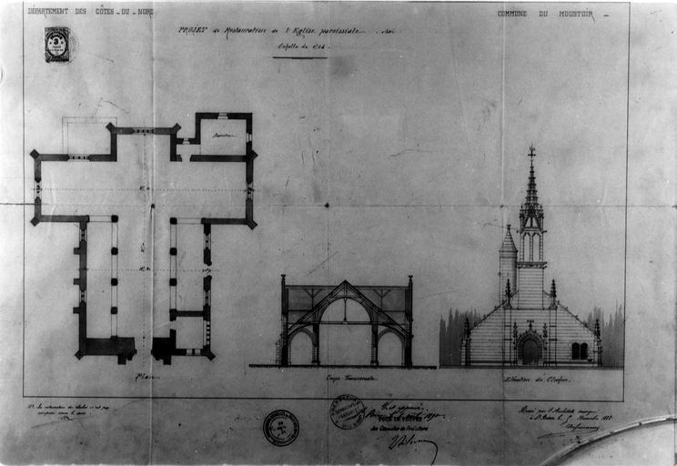 Reproduction d'une planche de Le Guerranic (5 nov. 1888) : plan, coupe transversale, élévation du clocher (projet de restauration)Immatriculation