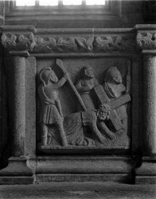 Clôture du choeur, côté sud : premier panneau, le Christ tombe pour la troisième foisImmatriculation