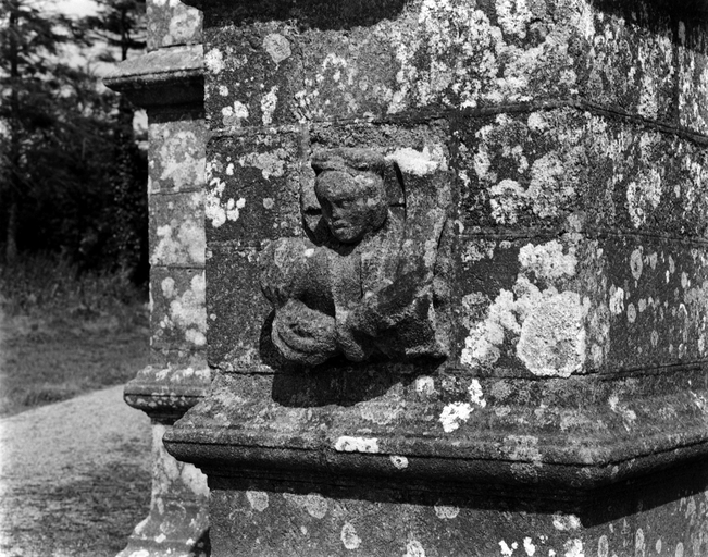 Façade ouest, détail (figurine sculptée à la base du contrefort nord)Immatriculation