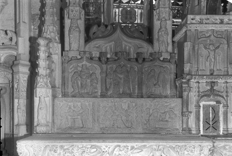 Autel, retable (maître-autel, retable architecturé à niche), style néo-gothique, église paroissiale Notre-Dame (Bulat-Pestivien),