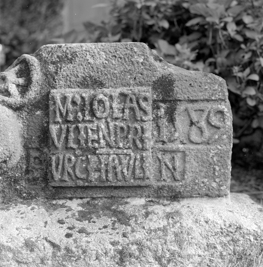 Pierre d'assise de rampant sculptée, détail de l'inscription.Immatriculation