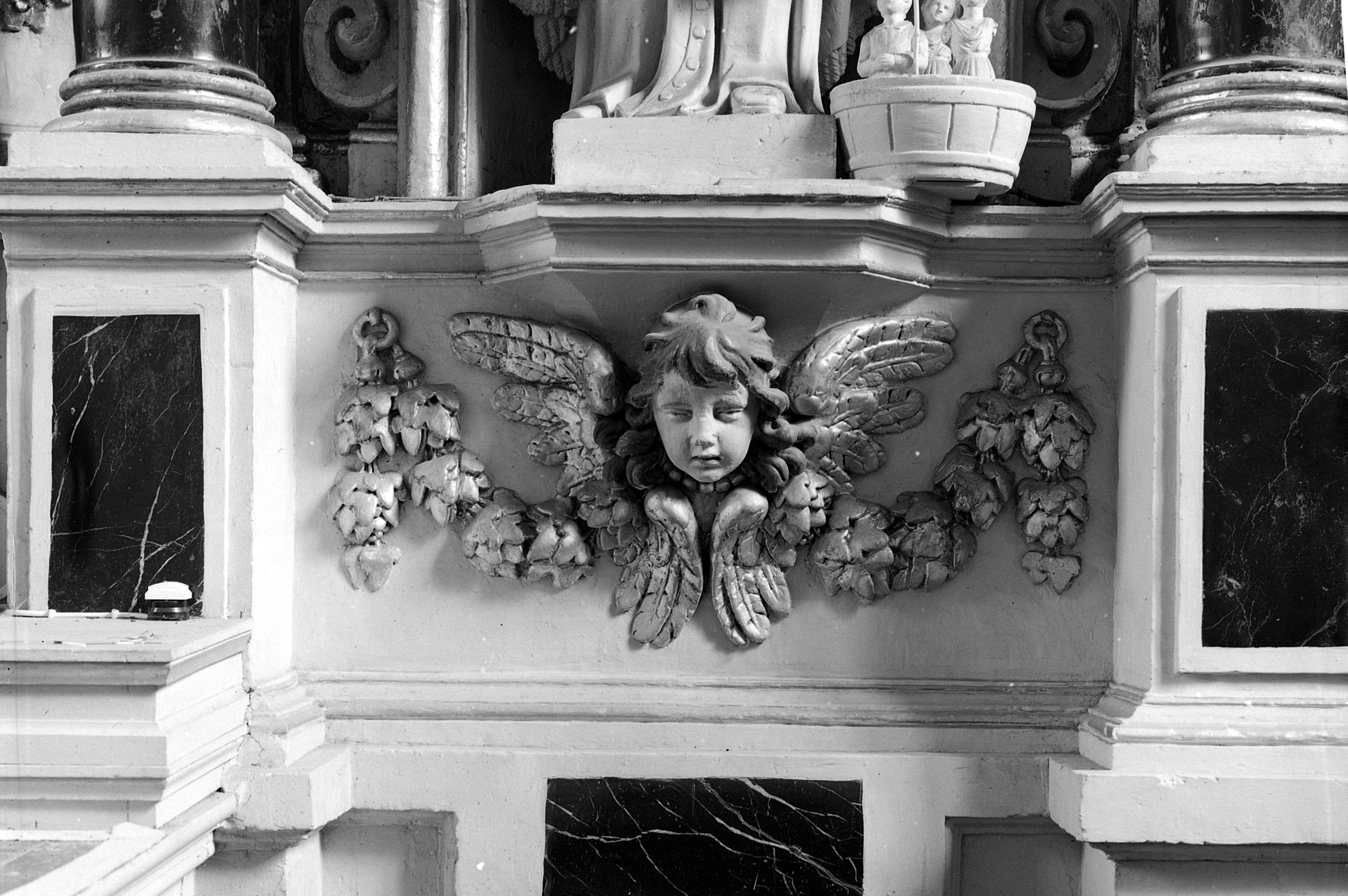 Retable du choeur, ange servant de console, vue de détail.Immatriculation