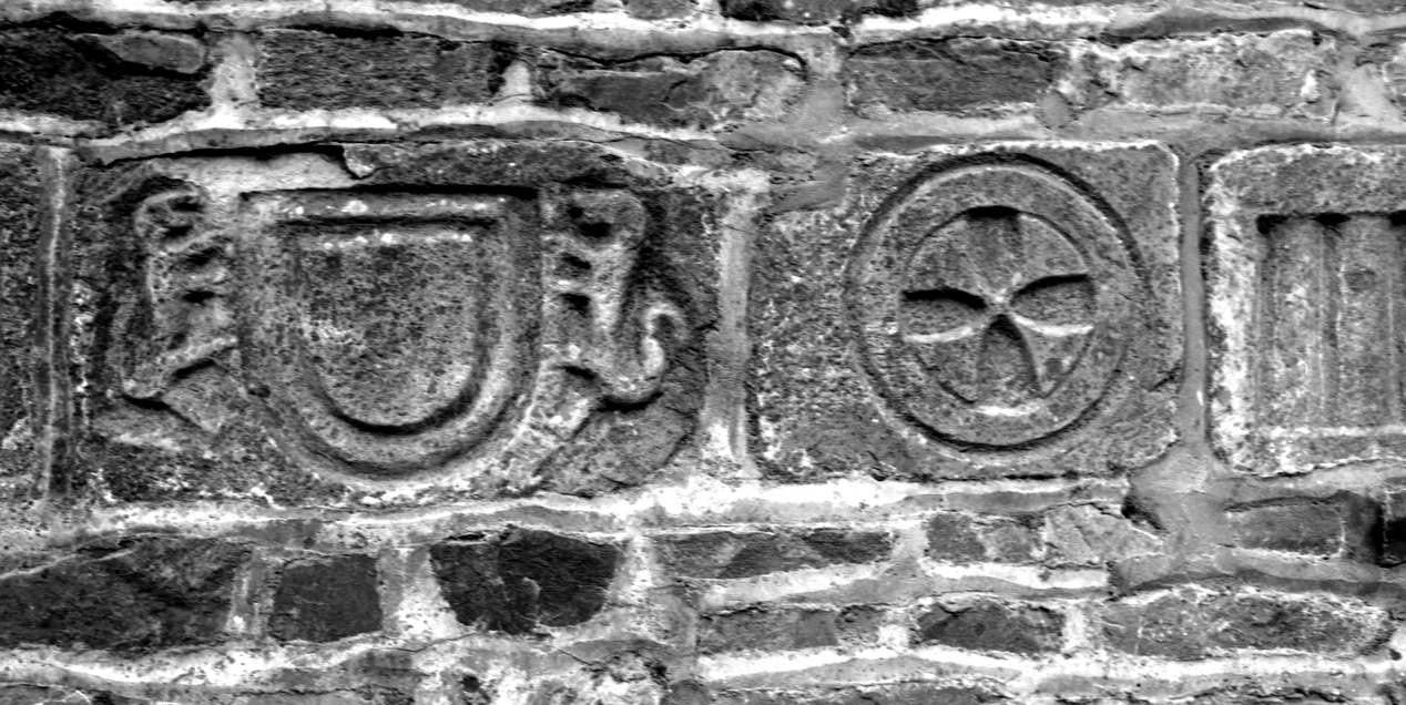 Maison du bourg, perron de la maison 12, pierres sculptées, vue de détail.Immatriculation