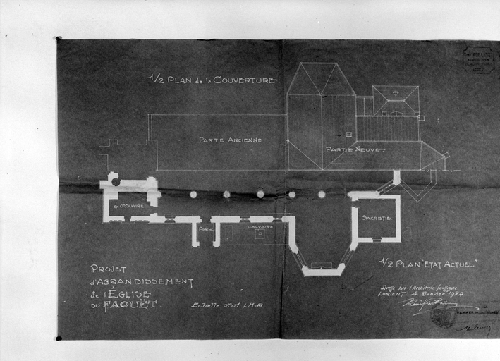 Projet de l'agrandissement de l'église, 1/2 plan de la couverture et 1/2 plan de l'état actuel, 4 janvier 1924 (Archives départementales du Morbihan, Série O, Le Faouët, travaux communaux).Immatriculation