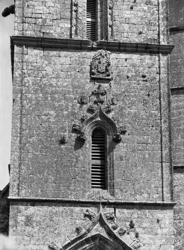 Façade ouest de la tour, deuxième niveau : détail de la fenêtre et de l'écuImmatriculation