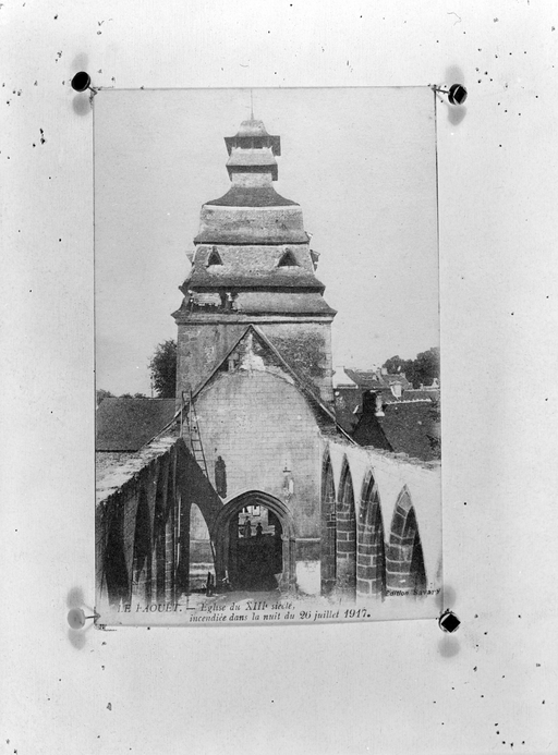 Carte postale ancienne - Vue générale du clocher après incendie (Archives départementales du Morbihan, 53-43).Immatriculation