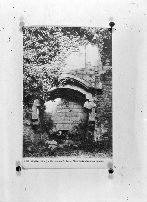 Carte postale ancienne - Priziac (Morbihan) - Manoir du Dréorz. Cheminée dans les ruines (Archives départementales du Morbihan, 187-7)Immatriculation