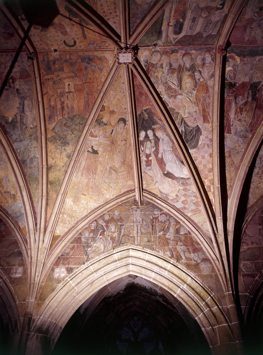 Fresques du choeur, vues générales : Ville de Jérusalem - Jésus au milieu des docteurs - Ange annonçant à la Vierge qu'elle va mourir - Dormition de la Vierge - Crucifixion.Immatriculation