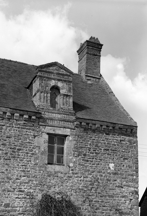 Façade sud : détail lucarne, corniche et souche de cheminée estImmatriculation