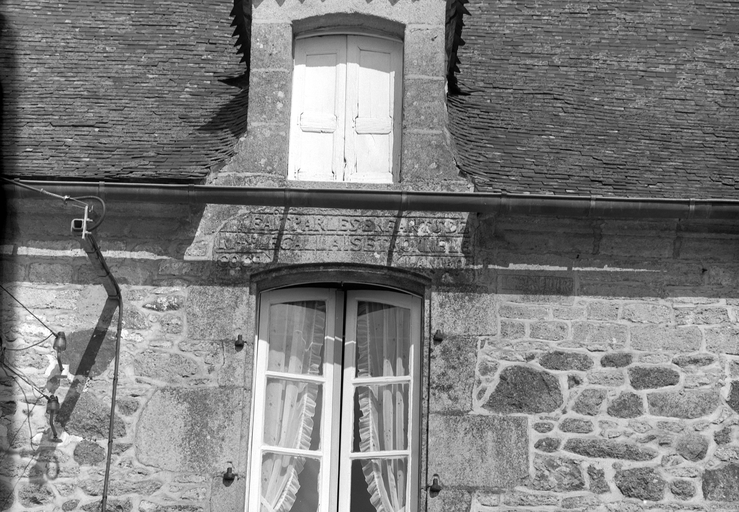 Maison au bourg : façade sud, détail linteau inscrit (fenêtre centrale, second niveau)Immatriculation