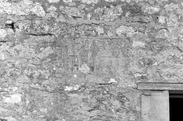 La Sécherie, maison 3 : dépendances, détail pierre inscrite (mur sud)Immatriculation
