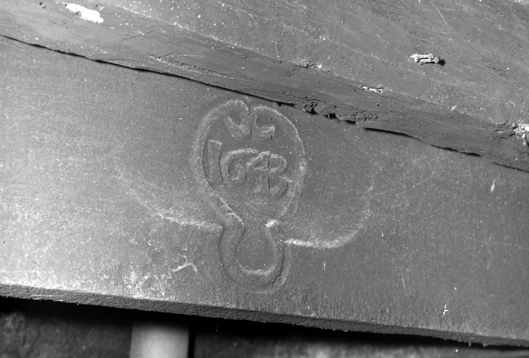 La Donnelais, maison : cheminée (rez-de-chaussée, pièce est, mur ouest) : détail du linteauImmatriculation