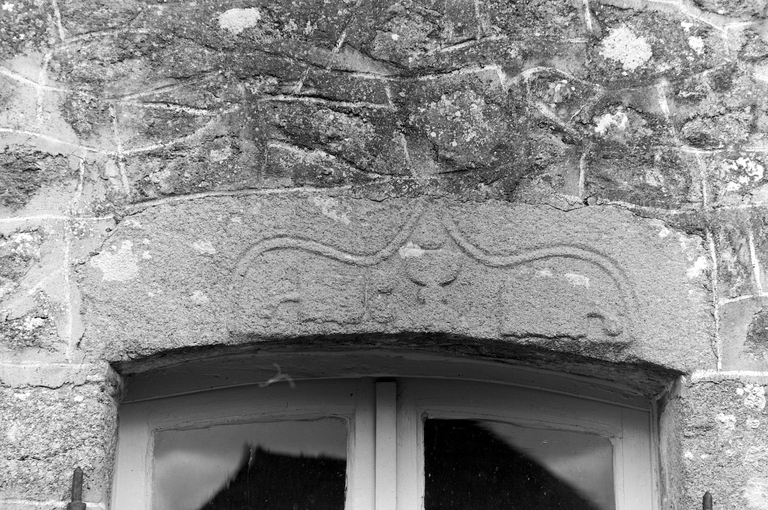 La Rehaudais, maison B : façade sud, détail relief du linteau (premier niveau, partie ouest)Immatriculation