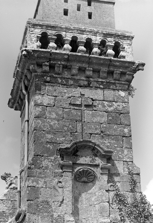 Façade ouest : détail de la base du clocher et de la balustradeImmatriculation