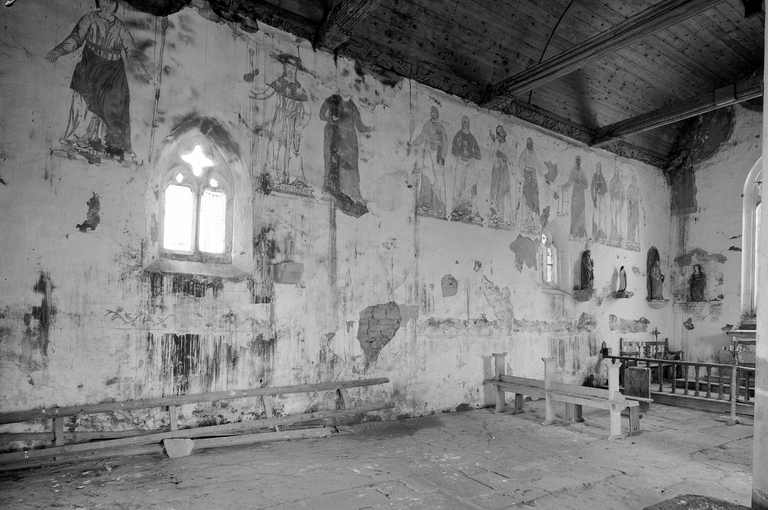 Plounévez-Moëdec : chapelle Sainte-Jeune, vue générale intérieure du mur nord : peintures muralesImmatriculation
