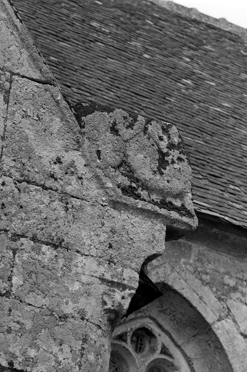 Porche sud, détail de la pierre d'assise sculptée du rampant estImmatriculation