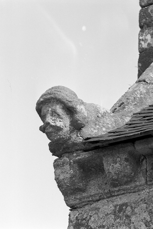Nef, façade sud : détail du corbeau inférieur de la chevronnière ouest et de la corniche à modillonsImmatriculation