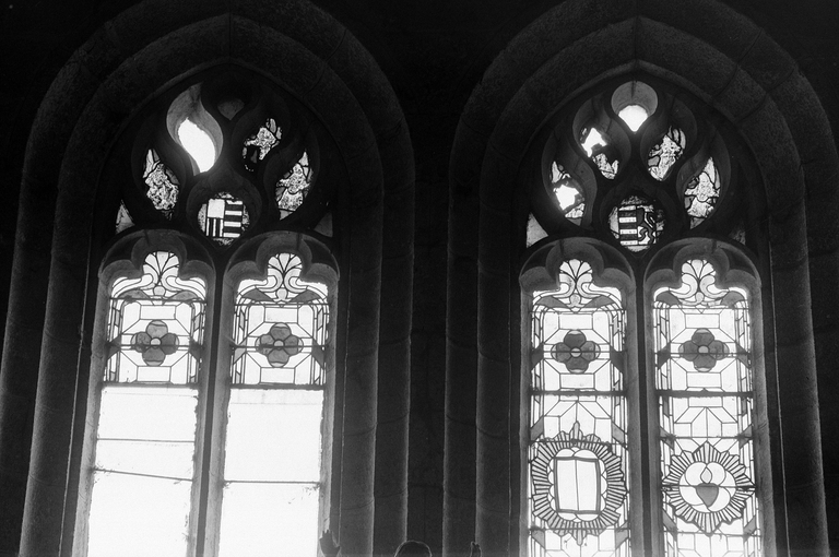 Chevet, double baie : détail du remplage et des armoiries. Fenêtres 9 et 10Immatriculation