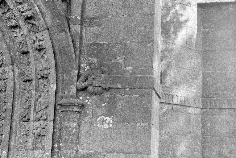 Façade ouest, porte : contrefort sud : détail de la figure sculptéeImmatriculation