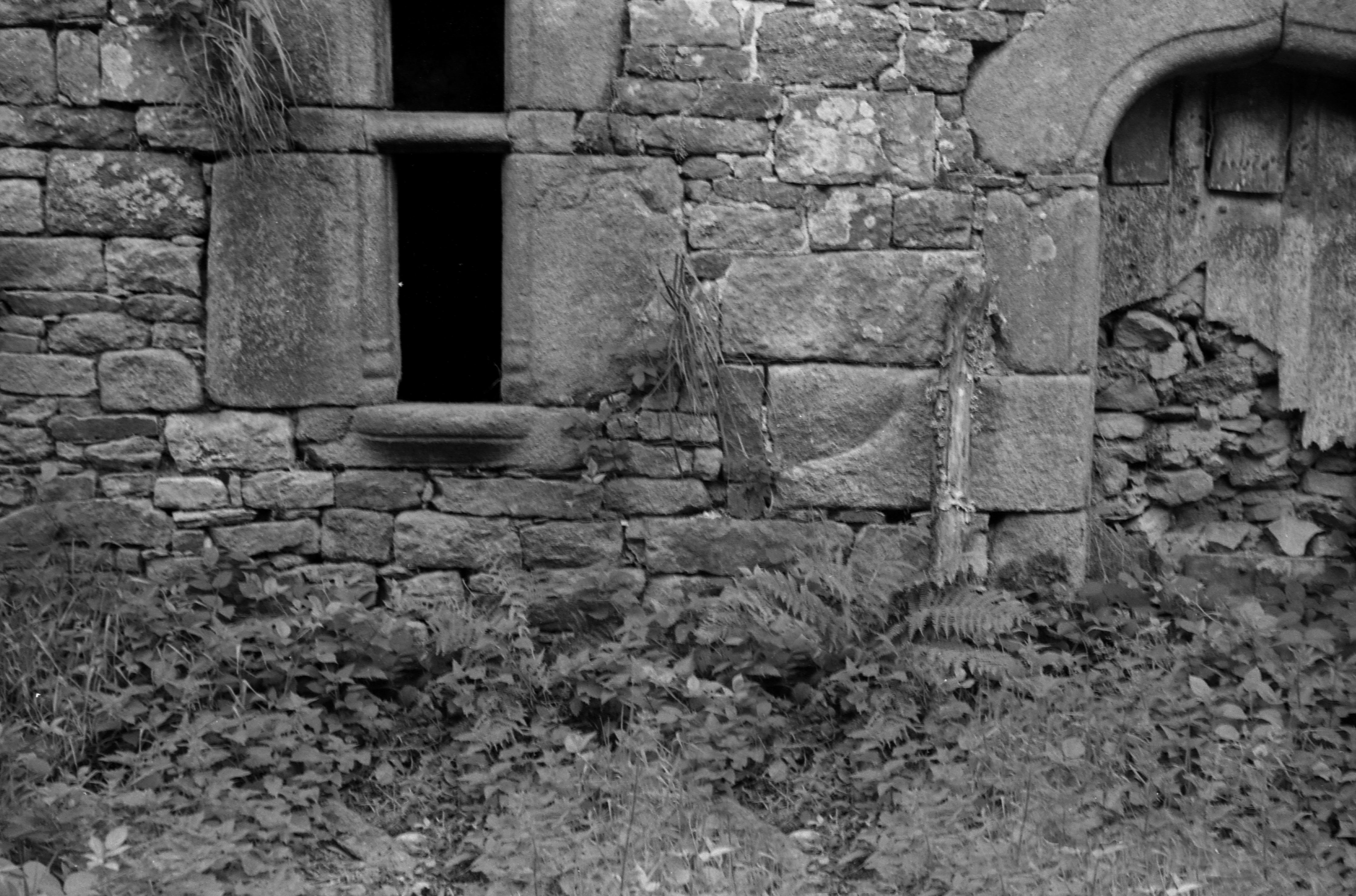 Plufur, Run ar Manac'h Braz : logis datable du 16e siècle, vue partielle de l'élévation antérieure (porte et fenêtre), photographie de 1969Immatriculation
