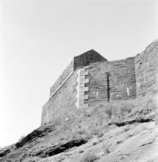 Vue de l'îlot des Capucins en 1969 : escarpe du front de gorge. A noter : les chaînes harpées d'angle en pierres de taille de graniteImmatriculation