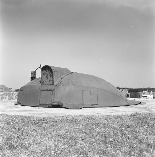 Vue arrière d'une tourelle de 105 mm Flak allemande (type en calotte sphérique) de la batterie de Tremet en 1969Immatriculation