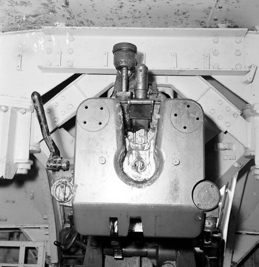 Vue de la culasse d'une pièce de 105 mm SK C/32 Flak allemande de la batterie de Tremet en 1969Immatriculation