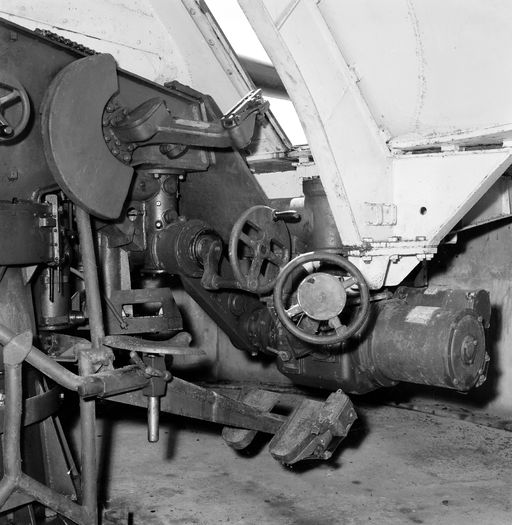 Vue du mécanisme de pointage d'une pièce de 105 mm SK C/32 Flak allemande de la batterie de Tremet en 1969Immatriculation