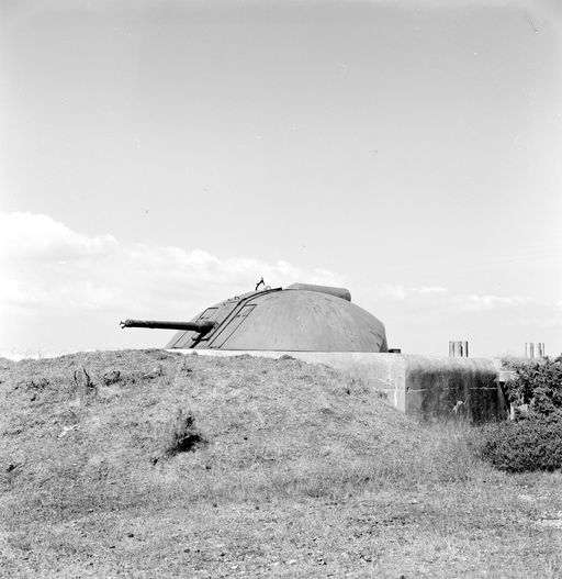 Vue d'une tourelle de 105 mm Flak allemande (type en calotte sphérique) de la batterie de Tremet en 1969Immatriculation