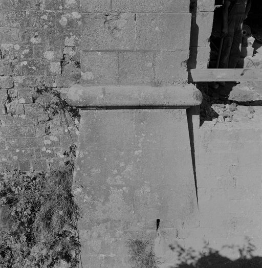 Vue du réduit de Quélern en 1969 : détail du soubassement du pilastre de la porte d'entrée monumentale datée 1854Immatriculation