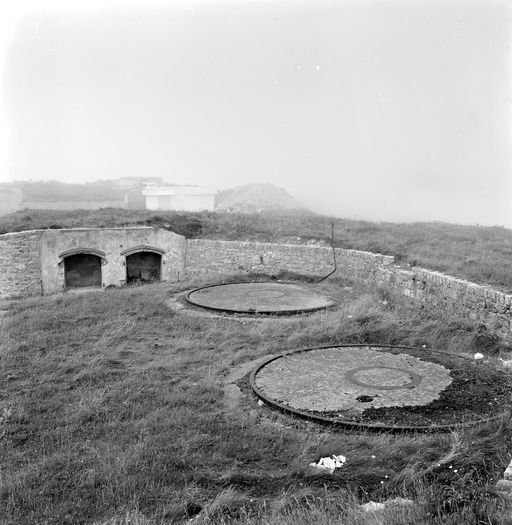 Vue de la batterie du Toulinguet en 1969 : plate-formes de pièces de la batterie de 24 cm, niches à munitionsImmatriculation