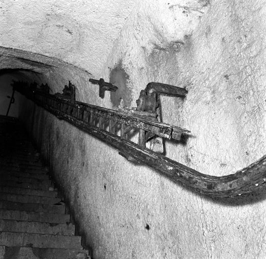 Vue de la batterie du Toulinguet en 1969 : escalier d'accès du magasin à poudre sous roc. A signaler : monorail pour le transport de munitionsImmatriculation