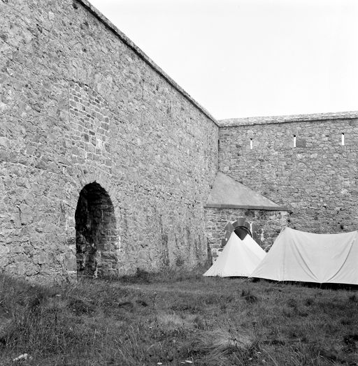 Vue de la batterie du Toulinguet en 1969 : front de gorge, poterne d'accès et débouché du monte-charge du magasin à poudre sous roc dans l'angle rentrantImmatriculation