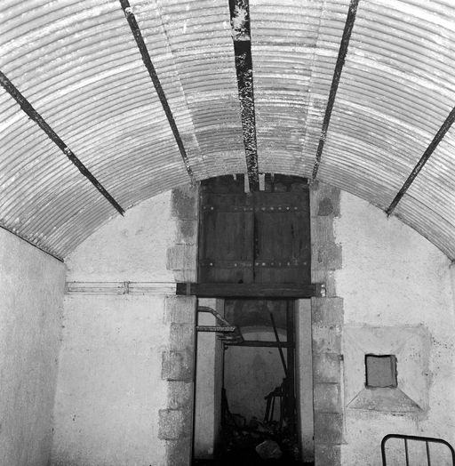 Vue de la batterie du Toulinguet en 1969 : magasin à poudre sous roc doublé de tôle-parapluie. A droite : fenêtre à lanterne / créneau de lanterne. A signaler : huisserie en placeImmatriculation