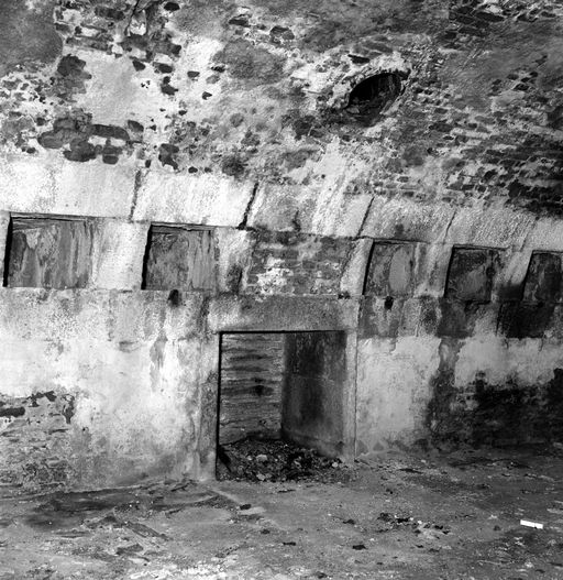 Vue de la tour-modèle n° 1 type 1811 de la pointe de Cornouaille en 1969 : deuxième niveau percé de créneaux de fusillade, cheminéeImmatriculation