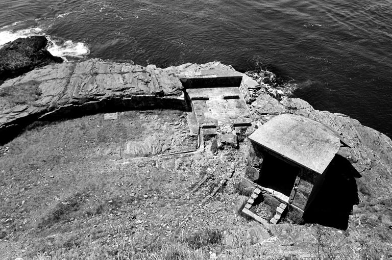 Vue de la partie sud-ouest de la batterie de l'îlot des Capucins en 1969. Poste de projecteur français, abri de combat ruiné ; installation photoélectriqueImmatriculation