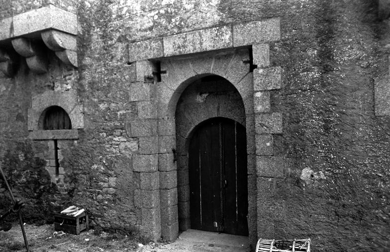 Vue du corps de garde crénelé n° 3 du bourg de Roscanvel en 1969 : porte d'entrée. A noter : la feuillure d'encastrement du pont-levis et le passage des chaînes de manoeuvreImmatriculation