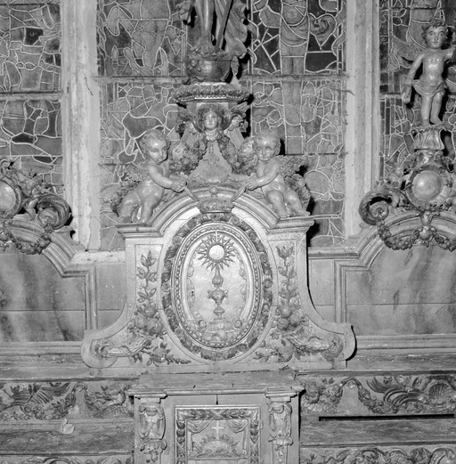 Gradins d'autel (2), autel, tabernacle (maître-autel, tabernacle à ailes), chapelle Notre-Dame-de-Bonne-Nouvelle (Cast),
