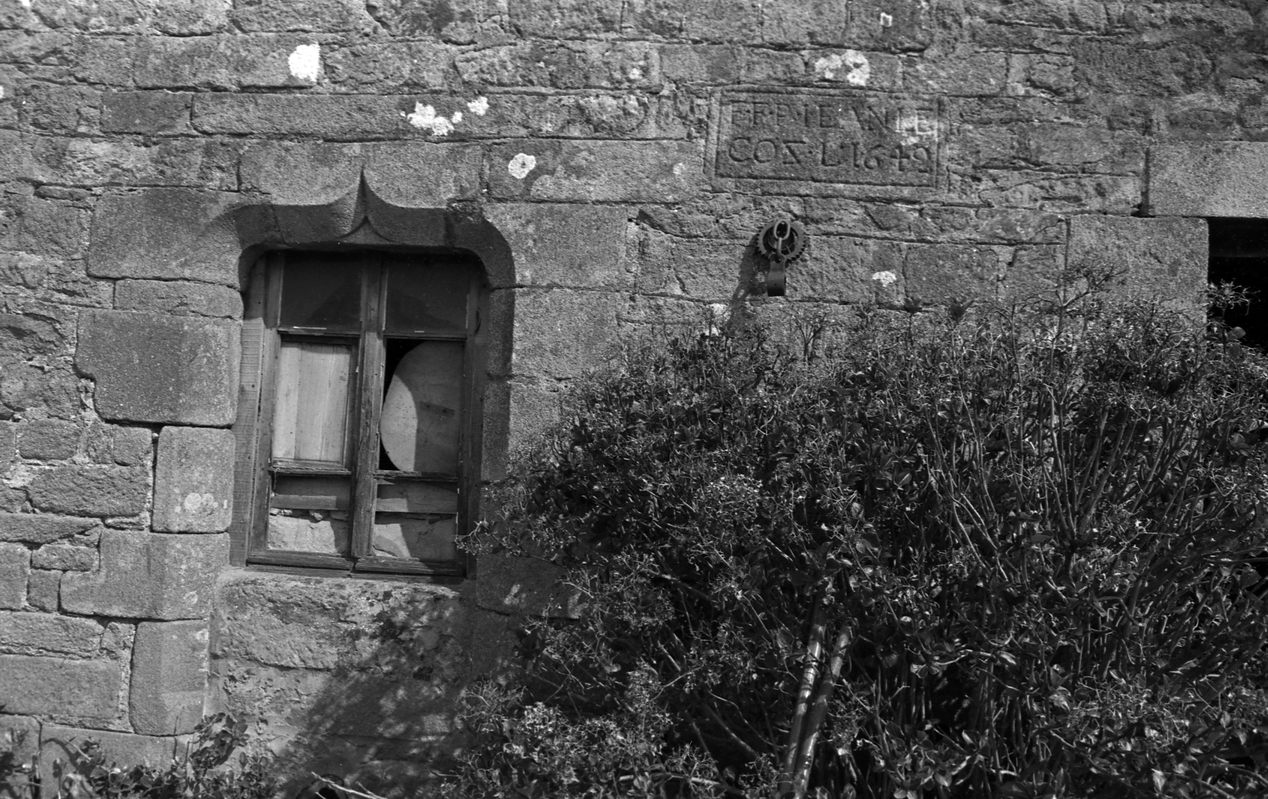 Mescalet - Maison, ancienne porte et inscription sur la façade sudImmatriculation