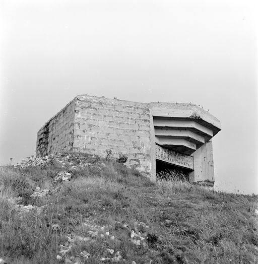 Vue en contre-plongée de l'un des trois bunkers - casemates pour canon de 164,7 mm en 1969 (le quatrième bunker a été détruit en 1944 par une explosion)Immatriculation