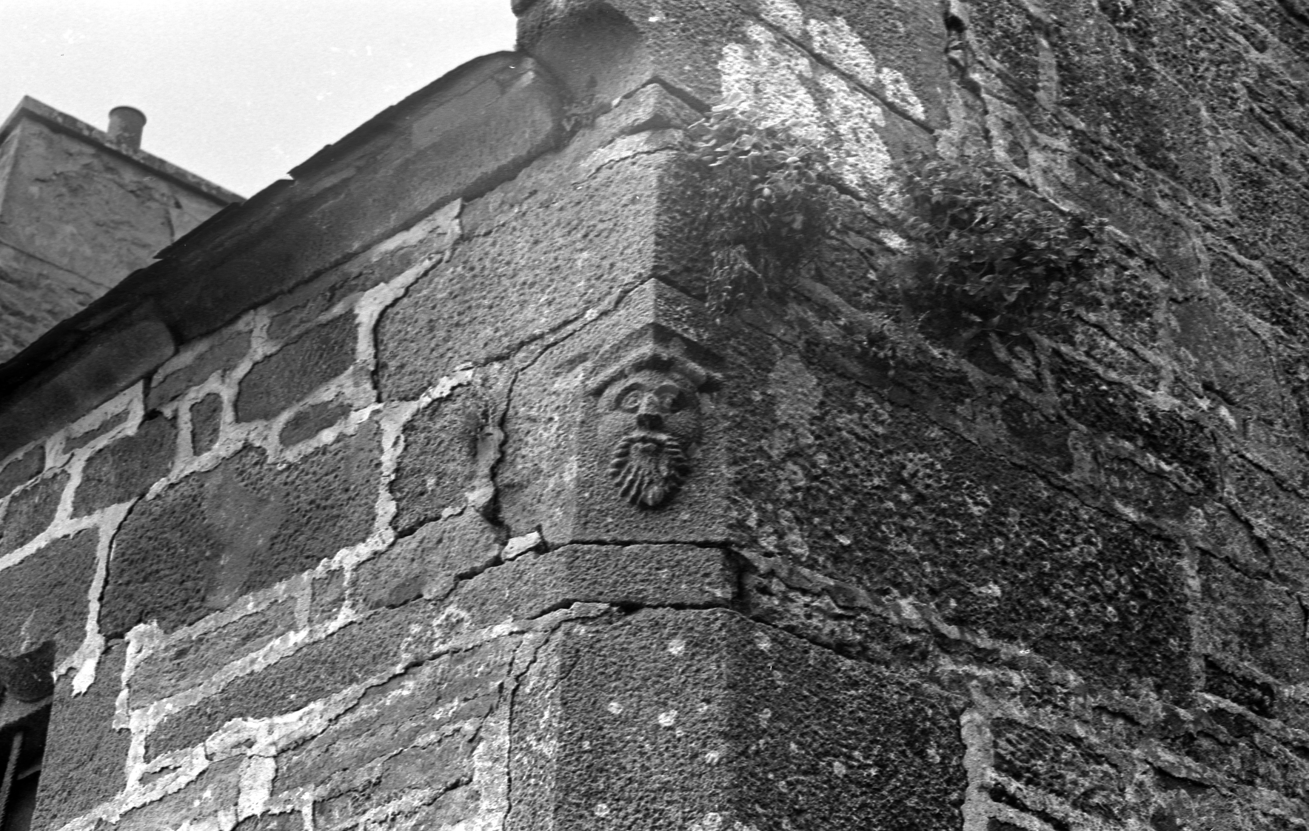 Logonna-Daoulas, le Rohou - Maison, 16e siècle (?), détail de la tête sculptée sur chainage d'angle en pierre de Kersanton (état en 1969)Immatriculation