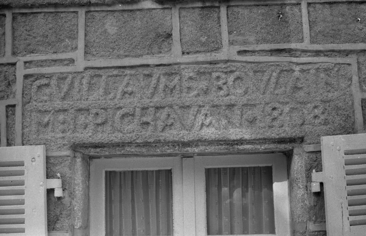 Logis, fenêtre sud, détail de l'inscription : GUILLAUME : BOULAIN / M : I : PICHAVAN . 1808. (1969)Immatriculation