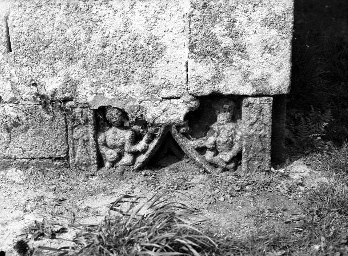 Sacristie - angle sud est, pierre de réemploi (fragments d'encadrement) : détailImmatriculation