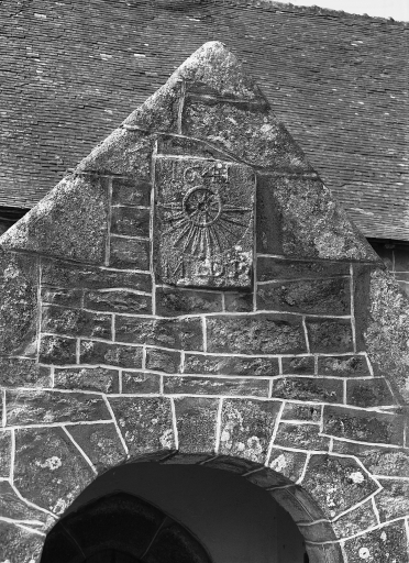 Face sud : porche, détail du cadran solaireImmatriculation