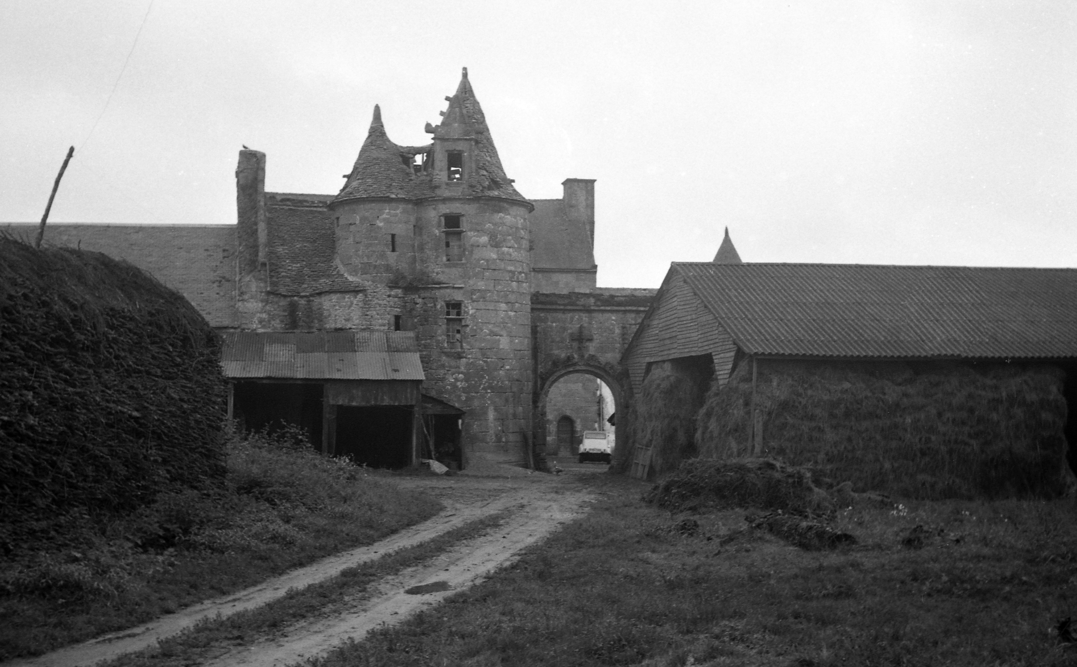 Trémel, Kermerzit : manoir, vue générale depuis le nord, portail au décor flamboyant percé d'une porte charretière et d'une porte piétonne (masquée par le hangar agricole), photographie de 1970Immatriculation