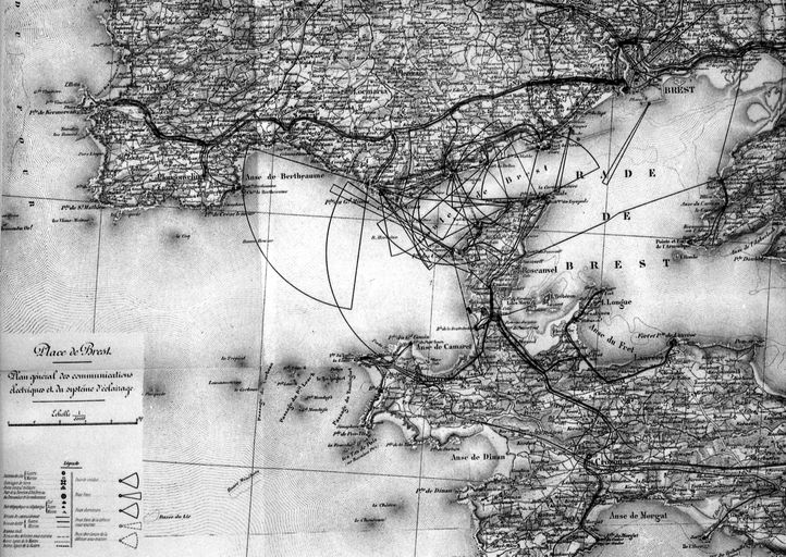 Place de Brest : plan général des communications électriques et des systèmes d'éclairage (champs de tir des pièces d'artillerie et des projecteurs), fin 19e siècleImmatriculation