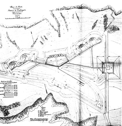 Plan de la batterie du Toulinguet (4 canons G de 24 cm modèle 1876 sur affûts G PC, 4 canons de 19 cm modèle 1875-1876 sur affûts G PC, 4 canons G de 95 mm sur affûts G de côte)Immatriculation