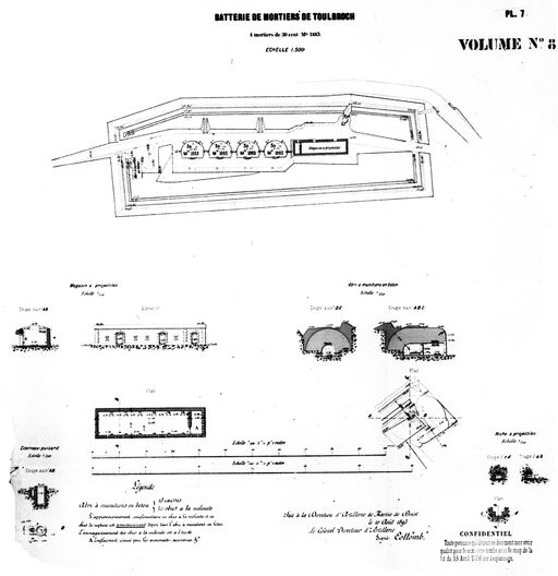 Plans et coupes de la batterie de mortier de Toulbroc'h, 1893 (Direction d'Artillerie du génie de Brest, colonel directeur d'Artillerie Collomb)Immatriculation