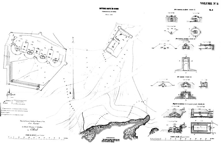 Plans et coupes de la batterie de 24 du Minou et de son magasin au matériel, 1893 (Direction d'Artillerie du génie de Brest, colonel directeur d'Artillerie Collomb)Immatriculation