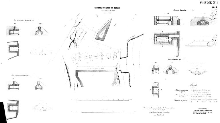 Plans et coupes de la batterie basse dite du Ravin du Mengant (4 canons de 32 cm modèle 1870-1881), Direction d'Artillerie du génie de Brest, 10 août 1893, par le colonel Directeur d'Artillerie : CollombImmatriculation